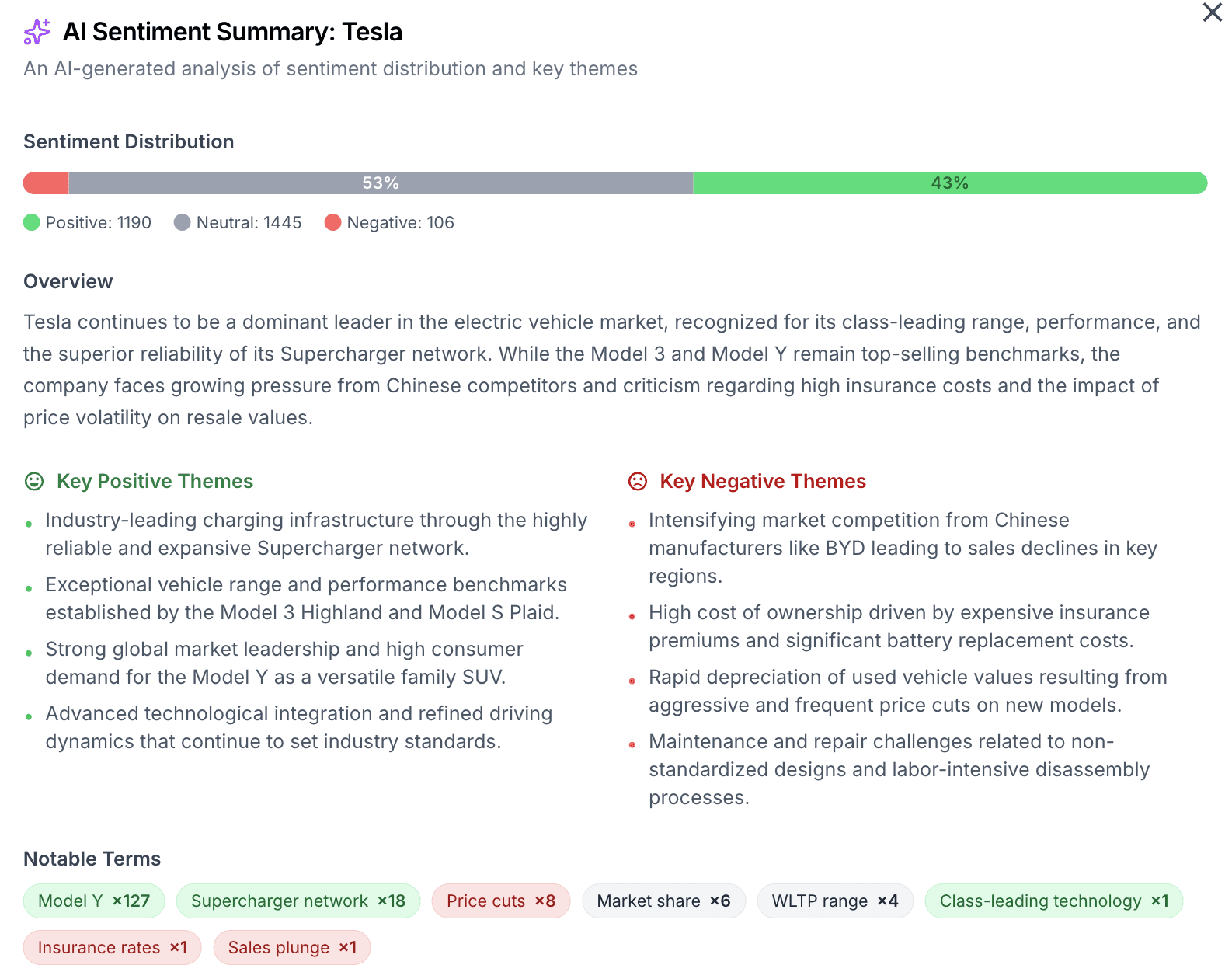 …and provides an AI sentiment summary (themes, key terms, frequency) so teams can react with clarity, not panic.
