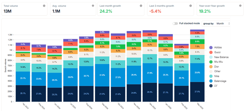 On Amazon, Balenciaga and Nike collectively capture 50% of luxury sneaker-related ecommerce searches, underscoring their dominant digital presence and strong conversion potential in the retail space.