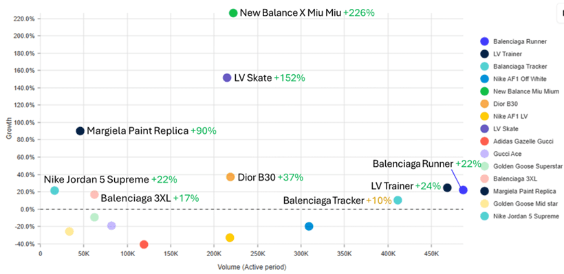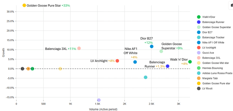 Dior’s B27 (+12%) and Balenciaga’s 3XL (+11%) reflect a growing appetite for statement sneakers blending heritage and hype.