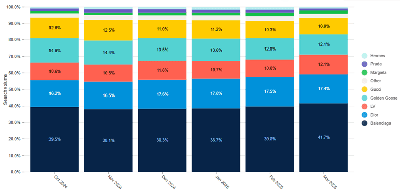 Balenciaga & Louis Vuitton own 50% of luxury sneaker google searches - highlighting their dominance in both brand visibility and consumer interest...