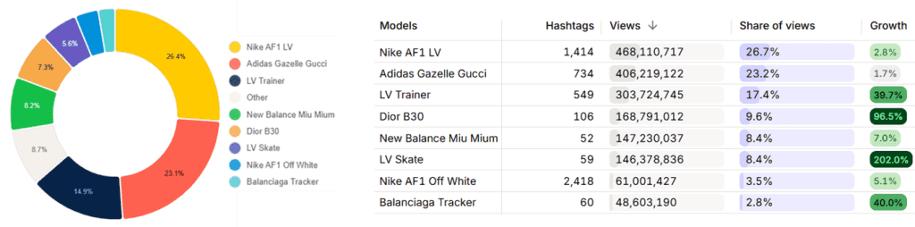The '90s-inspired aesthetics of the LV Skate sneaker are thriving in TikTok’s visual-first environment, while legacy collaborations like Off-White x Nike and Gucci x Gazelle maintain steady, yet gradually slowing, traction