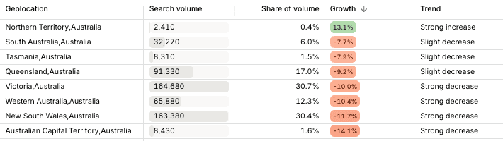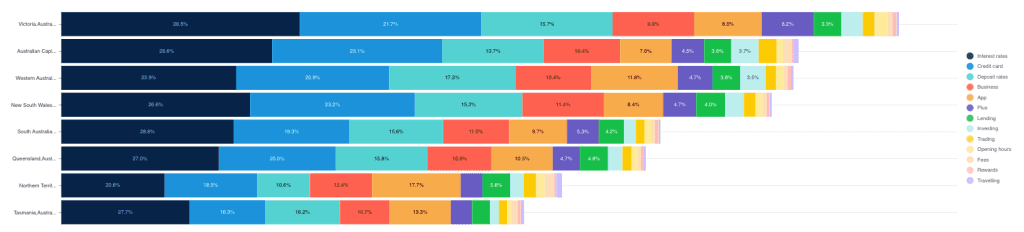 In contrast, Northern Territory Australia displays a proportionally higher interest in "Deposit rates" compared to other regions where the topic is decreasing, suggesting a more savings-oriented consumer base.