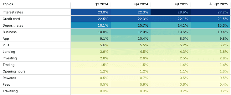 Credit cards outperformed: share rose 3 pts in June with strong brand demand. Use refreshed offers and reward copy to convert interest. Quarterly share slipped slightly to 21.5% in Q2 (vs 22.1% in Q1, 22.3% in Q4 2024).