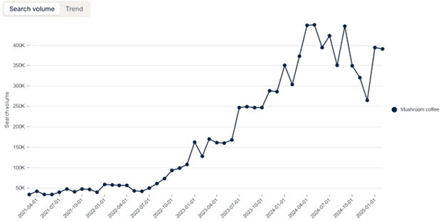 Health-conscious consumers are prioritizing beverages that support focus, sustainable energy, and well-being over traditional caffeine spikes. Mushroom coffee (+20%) is gaining traction for its natural stress-reducing properties and gut health support.
