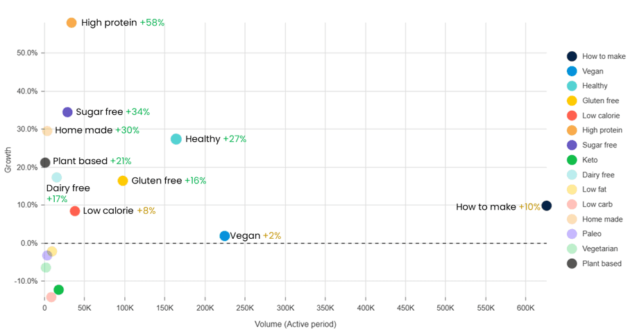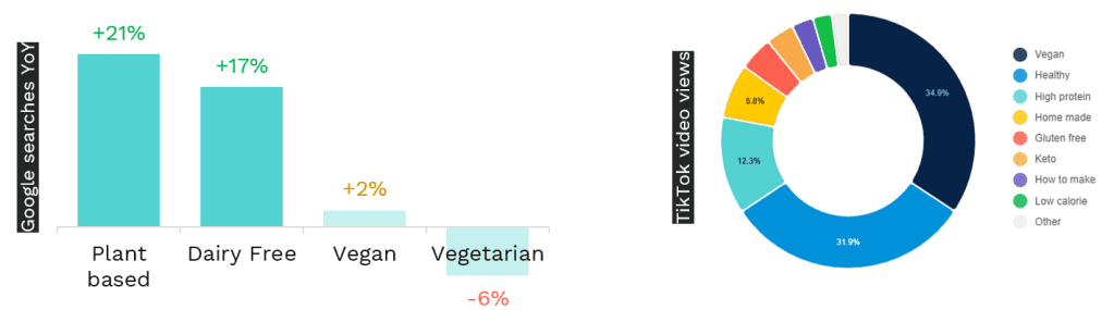 While 'Vegan' remains a trending topic on TikTok—accounting for just over a third of content views—consumer search behaviour tells a different story. Interest in strict dietary labels like 'vegan' (showing flat growth) and 'vegetarian' (down -6%) is declining. Instead, consumers are gravitating toward more flexible, lifestyle-driven choices, with searches for 'plant-based' up +21% and 'dairy-free' up +17% year-over-year.