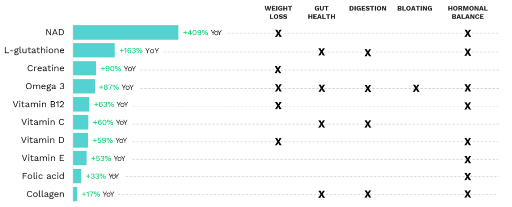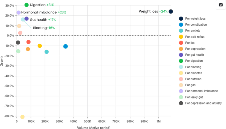While weight loss still tops search volume, consumers are shifting focus to the systems that support overall wellness—gut health, hormone balance, and digestion. Searches reflect this move toward root-cause wellness, with notable year-over-year increases in:
