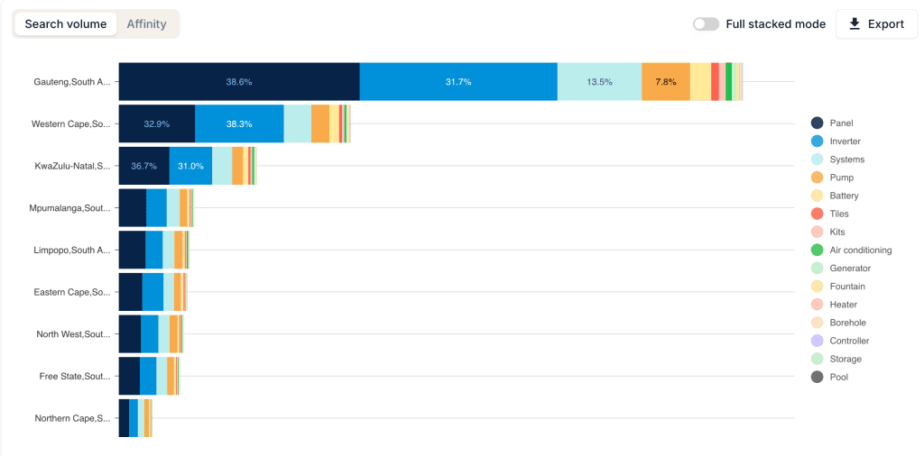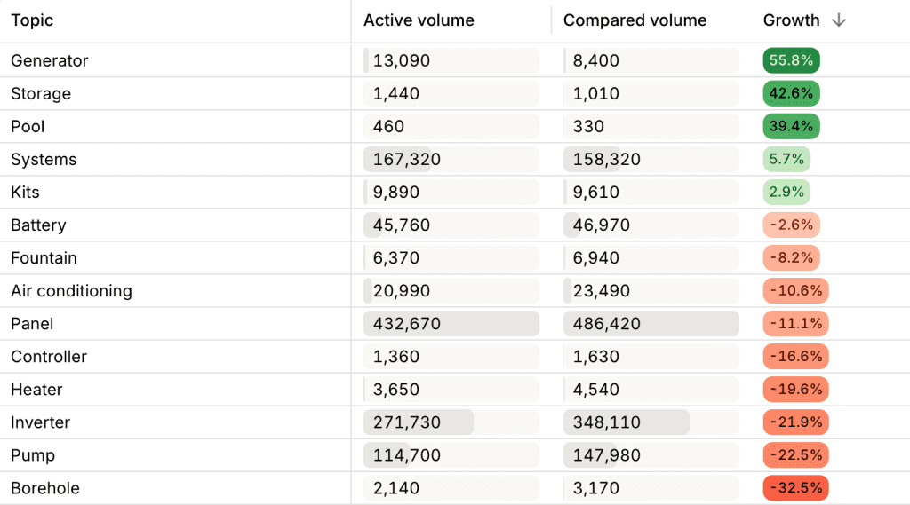 Although these topics have minimal volumes today, they represent nascent consumer experimentation. Given South Africa’s climate and rural population, solar irrigation and cooling could rapidly evolve from “weak signals” to mainstream demand segments.