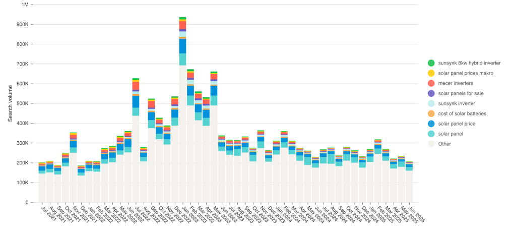 South Africa’s solar energy market is accelerating, fueled by rising electricity costs, frequent load shedding, and growing household and corporate demand for energy independence. Search data over the last 48 months reveals clear surges in interest for solar panels, pricing transparency, and battery storage, with brands like Mecer, Sunsynk, Deye, and Luxpower leading the way.