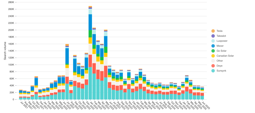 Battery-specific queries (e.g., Sunsynk battery) also highlight consumer interest in integrated systems.
